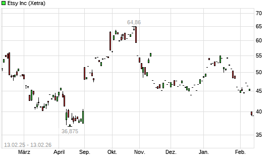 Mit dem Rücksetzer auf 38,88 EUR hat die Etsy-Aktie (ISIN US29786A1060) am 12.02.2026 ein neues 6-Monats-Tief erreicht und damit den Kurs vom 03.09.2025 eingestellt.