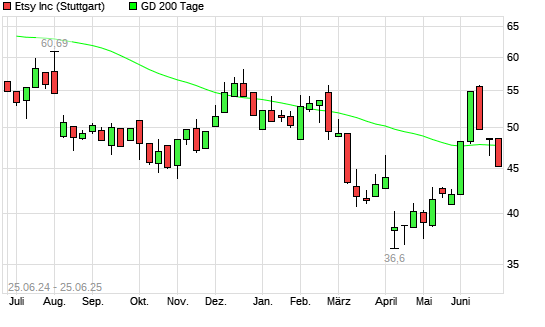 Mit dem Rücksetzer auf 46,14 EUR hat die Etsy-Aktie am 24.06.2025 die 200-Tage-Linie nach unten gekreuzt.
