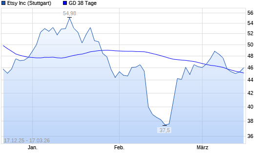 Mit dem Anstieg auf 46,04 EUR hat die Etsy-Aktie am 16.03.2026 die 38-Tage-Linie nach oben gekreuzt.Die Etsy-Aktie befindet sich seit dem 27.01.2026 im langfristigen Abwärtstrend und ...weiterlesen