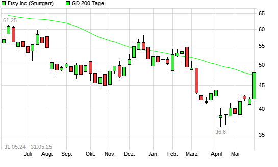 Mit dem Anstieg auf 48,70 EUR hat die Etsy-Aktie am 30.05.2025 die 200-Tage-Linie nach oben gekreuzt.Die Etsy-Aktie befand sich seit dem 20.02.2025 im langfristigen Aufwärtstrend und hat in ...weiterlesen