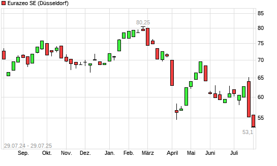 Mit dem Rücksetzer auf 53,05 EUR hat die Eurazeo-Aktie (ISIN FR0000121121) am 28.07.2025 ein neues 12-Monats-Tief erreicht und damit den Kurs vom 08.04.2025 eingestellt.