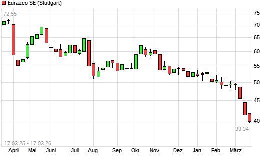 Mit dem Rücksetzer auf 39,78 EUR hat die Eurazeo-Aktie (ISIN FR0000121121) am 16.03.2026 ein neues 5-Jahres-Tief erreicht und damit den Kurs vom 12.03.2026 eingestellt.