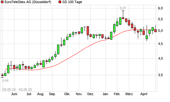 Mit dem Rücksetzer auf 4,90 EUR hat die EuroTeleSites AG-Aktie am 02.05.2025 die 100-Tage-Linie nach unten gekreuzt.