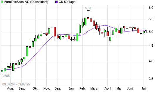 Mit dem Rücksetzer auf 5,00 EUR hat die EuroTeleSites AG-Aktie am 08.07.2025 die 50-Tage-Linie nach unten gekreuzt.