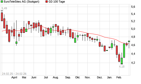 Mit dem Anstieg auf 4,66 EUR hat die EuroTeleSites AG-Aktie am 23.02.2026 die 100-Tage-Linie nach oben gekreuzt.Die EuroTeleSites AG-Aktie befindet sich seit dem 08.09.2025 ...weiterlesen