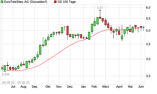Mit dem Anstieg auf 5,18 EUR hat die EuroTeleSites AG-Aktie am 04.06.2025 die 100-Tage-Linie nach oben gekreuzt.Die EuroTeleSites AG-Aktie befindet sich seit dem 08.04.2025 im langfristigen ...weiterlesen
