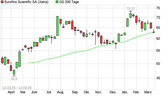 Mit dem Rücksetzer auf 63,20 EUR hat die Eurofins Scientific-Aktie am 11.03.2026 die 200-Tage-Linie nach unten gekreuzt.
