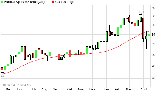 Mit dem Rücksetzer auf 34,10 EUR hat die Eurokai-Aktie am 15.04.2025 die 100-Tage-Linie nach unten gekreuzt.