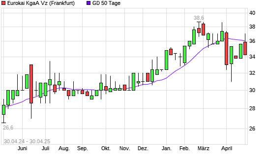 Mit dem Rücksetzer auf 35,30 EUR hat die Eurokai-Aktie am 29.04.2025 die 50-Tage-Linie nach unten gekreuzt.