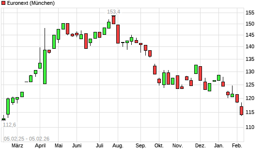 Mit dem Rücksetzer auf 112,40 EUR hat die Euronext-Aktie (ISIN NL0006294274) am 04.02.2026 ein neues 6-Monats-Tief erreicht und damit den Kurs vom 03.02.2026 eingestellt.