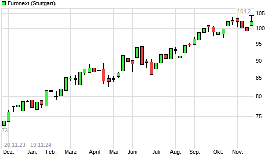 Mit dem Anstieg auf 103,60 EUR hat die Euronext-Aktie (ISIN NL0006294274) am 18.11.2024 ein neues All-Time-High erreicht und damit den Kurs vom 24.10.2024 eingestellt.