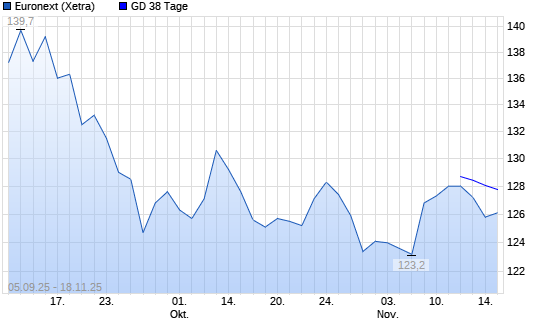 Mit dem Anstieg auf 126,00 EUR hat die Euronext-Aktie am 17.11.2025 die 38-Tage-Linie nach oben gekreuzt.