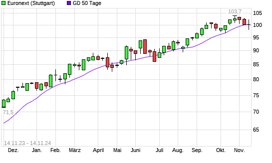 Mit dem Rücksetzer auf 97,15 EUR hat die Euronext-Aktie am 13.11.2024 die 50-Tage-Linie nach unten gekreuzt.