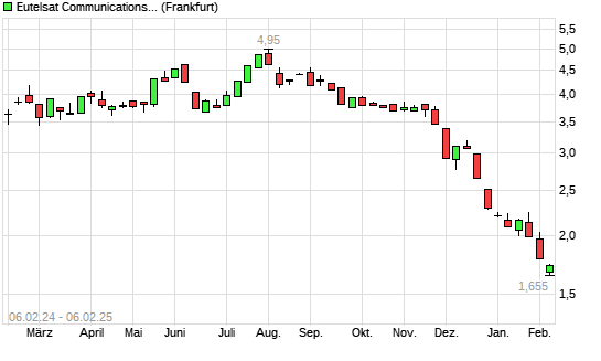 Mit dem Rücksetzer auf 1,67 EUR hat die Eutelsat Communications-Aktie (ISIN FR0010221234) am 05.02.2025 ein neues All-Time-Low erreicht und damit den Kurs vom 04.02.2025 eingestellt.