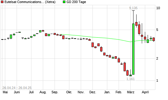Mit dem Rücksetzer auf 3,50 EUR hat die Eutelsat Communications-Aktie am 25.04.2025 die 200-Tage-Linie nach unten gekreuzt.