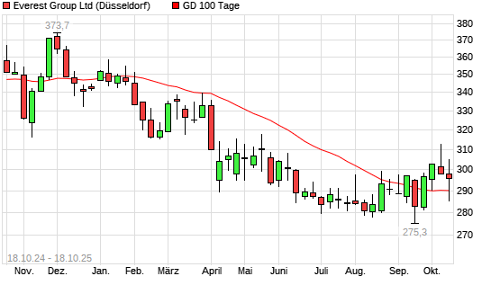 Mit dem Rücksetzer auf 287,60 EUR hat die Everest Re-Aktie am 17.10.2025 die 100-Tage-Linie nach unten gekreuzt.