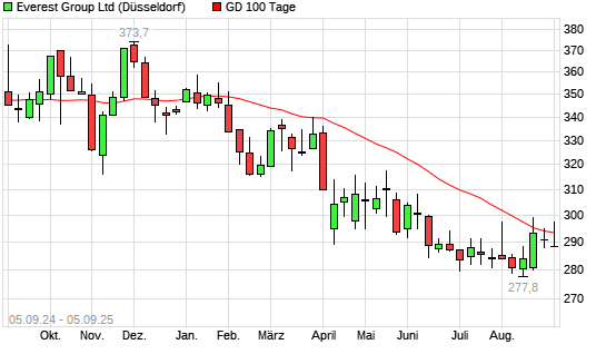 Mit dem Anstieg auf 297,70 EUR hat die Everest Re-Aktie am 04.09.2025 die 100-Tage-Linie nach oben gekreuzt.Die Everest Re-Aktie befindet sich seit dem 30.01.2025 im langfristigen Abwärtstrend ...weiterlesen