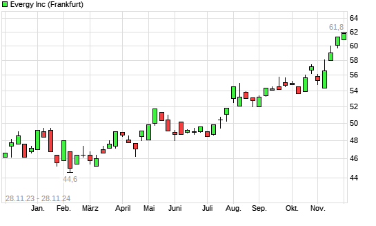 Mit dem Anstieg auf 61,40 EUR hat die Evergy-Aktie (ISIN US30034W1062) am 27.11.2024 ein neues 12-Monats-Hoch erreicht und damit den Kurs vom 22.11.2024 eingestellt.