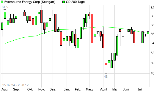 Mit dem Rücksetzer auf 56,00 EUR hat die Eversource Energy-Aktie am 24.07.2025 die 200-Tage-Linie nach unten gekreuzt.Die Eversource Energy-Aktie befand sich seit dem 23.07.2025 im langfristigen ...weiterlesen
