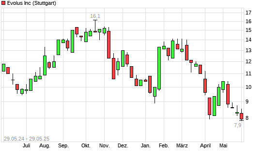 Mit dem Rücksetzer auf 7,90 EUR hat die Evolus-Aktie (ISIN US30052C1071) am 28.05.2025 ein neues 12-Monats-Tief erreicht und damit den Kurs vom 11.04.2025 eingestellt.
