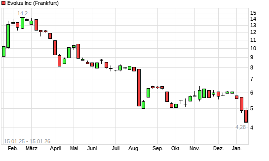 Mit dem Rücksetzer auf 4,86 EUR hat die Evolus-Aktie (ISIN US30052C1071) am 14.01.2026 ein neues 3-Jahres-Tief erreicht und damit den Kurs vom 09.01.2026 eingestellt.