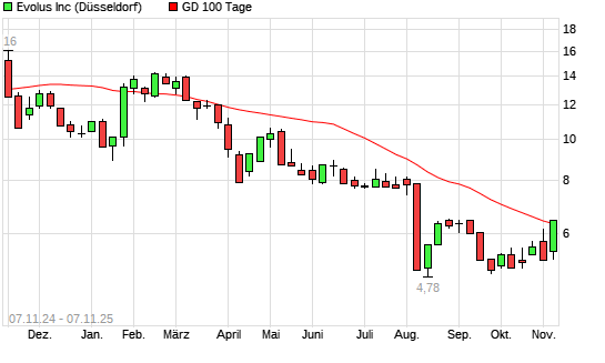 Mit dem Anstieg auf 6,45 EUR hat die Evolus-Aktie am 06.11.2025 die 100-Tage-Linie nach oben gekreuzt.Die Evolus-Aktie befindet sich seit dem 07.03.2025 im langfristigen Abwärtstrend und hat ...weiterlesen
