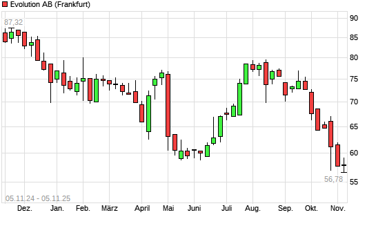 Mit dem Rücksetzer auf 57,14 EUR hat die Evolution Gaming Group-Aktie (ISIN SE0012673267) am 04.11.2025 ein neues 5-Jahres-Tief erreicht und damit den Kurs vom 31.10.2025 eingestellt.