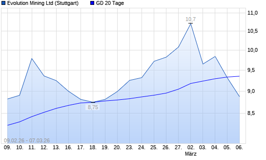 Mit dem Rücksetzer auf 8,88 EUR hat die Evolution Mining-Aktie am 06.03.2026 die 20-Tage-Linie nach unten gekreuzt.