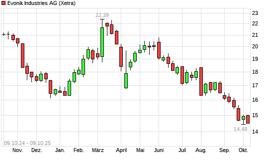 Mit dem Rücksetzer auf 14,61 EUR hat die Evonik Industries-Aktie (ISIN DE000EVNK013) am 08.10.2025 ein neues All-Time-Low erreicht und damit den Kurs vom 29.09.2025 eingestellt.