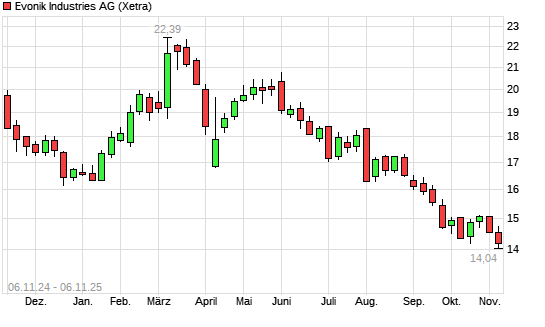 Mit dem Rücksetzer auf 14,14 EUR hat die Evonik Industries-Aktie (ISIN DE000EVNK013) am 05.11.2025 ein neues All-Time-Low erreicht und damit den Kurs vom 10.10.2025 eingestellt.