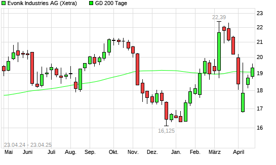 Mit dem Anstieg auf 19,11 EUR hat die Evonik Industries-Aktie am 22.04.2025 die 200-Tage-Linie nach oben gekreuzt.
