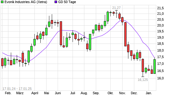 Mit dem Anstieg auf 17,23 EUR hat die Evonik Industries-Aktie am 16.01.2025 die 50-Tage-Linie nach oben gekreuzt.