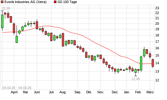Mit dem Rücksetzer auf 13,54 EUR hat die Evonik Industries-Aktie am 03.03.2026 die 100-Tage-Linie nach unten gekreuzt.