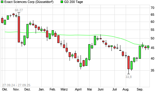 Mit dem Anstieg auf 45,74 EUR hat die Exact Sciences-Aktie am 26.09.2025 die 200-Tage-Linie nach oben gekreuzt.