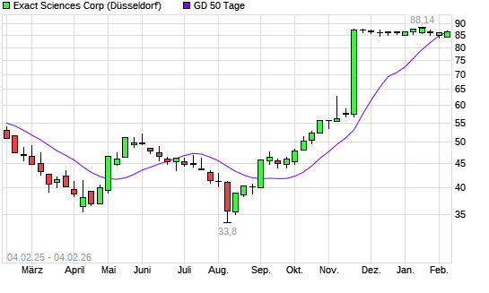 Mit dem Anstieg auf 86,47 EUR hat die Exact Sciences-Aktie am 03.02.2026 die 50-Tage-Linie nach oben gekreuzt.