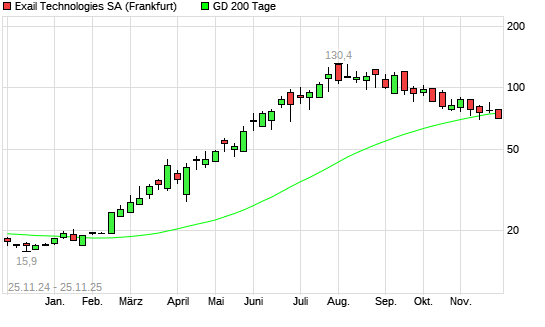 Mit dem Rücksetzer auf 71,10 EUR hat die Exail Technologies-Aktie am 24.11.2025 die 200-Tage-Linie nach unten gekreuzt.