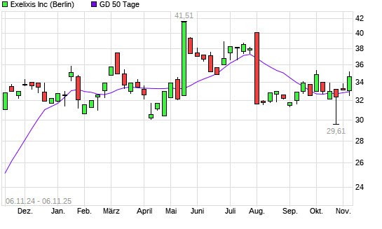 Mit dem Anstieg auf 33,11 EUR hat die Exelixis-Aktie am 05.11.2025 die 50-Tage-Linie nach oben gekreuzt.