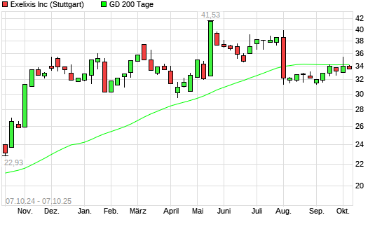Mit dem Rücksetzer auf 34,01 EUR hat die Exelixis-Aktie am 06.10.2025 die 200-Tage-Linie nach unten gekreuzt.