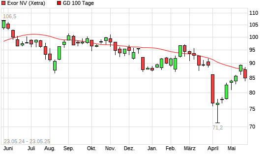 Mit dem Rücksetzer auf 87,80 EUR hat die Exor-Aktie am 22.05.2025 die 100-Tage-Linie nach unten gekreuzt.