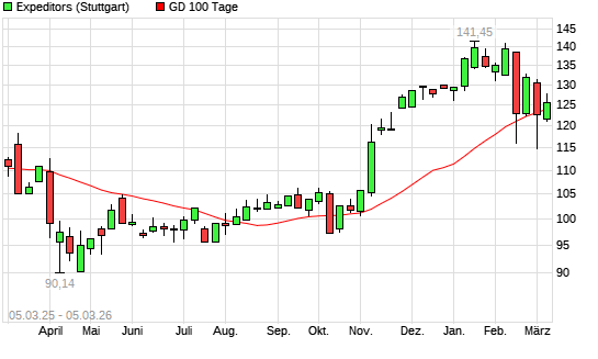 Mit dem Anstieg auf 125,60 EUR hat die Expeditors-Aktie am 04.03.2026 die 100-Tage-Linie nach oben gekreuzt.