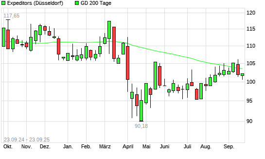 Mit dem Rücksetzer auf 100,15 EUR hat die Expeditors-Aktie am 22.09.2025 die 200-Tage-Linie nach unten gekreuzt.