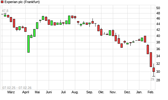 Mit dem Rücksetzer auf 28,80 EUR hat die Experian-Aktie (ISIN GB00B19NLV48) am 06.02.2026 ein neues 12-Monats-Tief erreicht und damit den Kurs vom 03.02.2026 eingestellt.