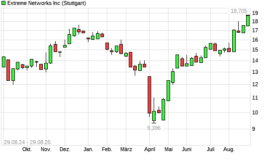 Mit dem Anstieg auf 18,10 EUR hat die Extreme Networks-Aktie (ISIN US30226D1063) am 28.08.2025 ein neues 12-Monats-Hoch erreicht und damit den Kurs vom 18.12.2024 eingestellt.