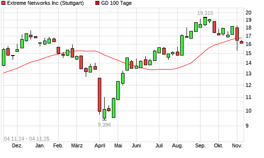 Mit dem Rücksetzer auf 16,34 EUR hat die Extreme Networks-Aktie am 03.11.2025 die 100-Tage-Linie nach unten gekreuzt.