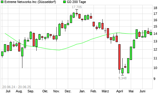 Mit dem Rücksetzer auf 14,06 EUR hat die Extreme Networks-Aktie am 19.06.2025 die 200-Tage-Linie nach unten gekreuzt.