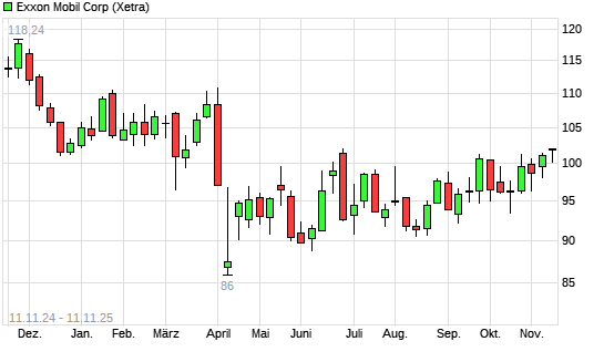 Mit dem Anstieg auf 102,26 EUR hat die Exxon Mobil-Aktie (ISIN US30231G1022) am 10.11.2025 ein neues 6-Monats-Hoch erreicht und damit den Kurs vom 07.11.2025 eingestellt.