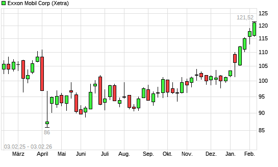 Mit dem Anstieg auf 118,26 EUR hat die Exxon Mobil-Aktie (ISIN US30231G1022) am 02.02.2026 ein neues All-Time-High erreicht und damit den Kurs vom 30.01.2026 eingestellt.