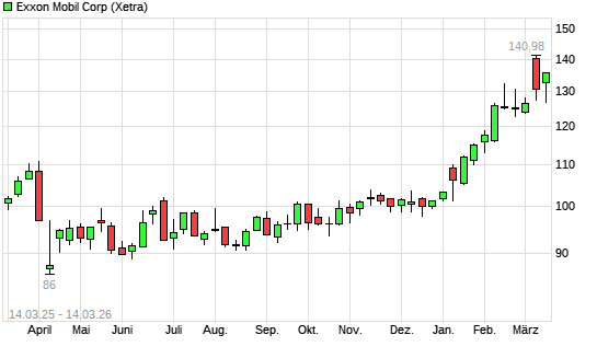 Mit dem Anstieg auf 136,30 EUR hat die Exxon Mobil-Aktie (ISIN US30231G1022) am 13.03.2026 ein neues All-Time-High erreicht und damit den Kurs vom 12.03.2026 eingestellt.
