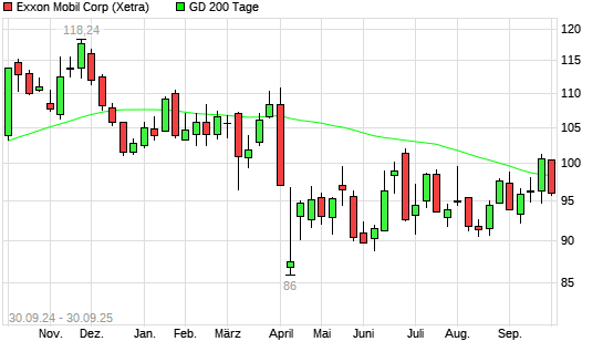 Mit dem Rücksetzer auf 97,45 EUR hat die Exxon Mobil-Aktie am 29.09.2025 die 200-Tage-Linie nach unten gekreuzt.