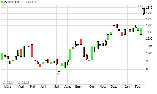 Mit dem Anstieg auf 13,40 EUR hat die Ezcorp-Aktie (ISIN US3023011063) am 12.02.2025 ein neues 10-Jahres-Hoch erreicht und damit den Kurs vom 10.02.2025 eingestellt.